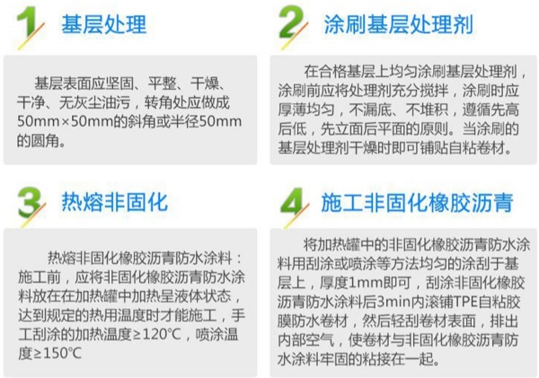 應用范圍非固化橡膠瀝青防水涂料既可用于新建防水層,也可用于修復受損防水層;既可用于常規(guī)區(qū)域的防水,也可用于變形縫等特殊區(qū)域的防水,相對于其它防水材料,它對特殊區(qū)域的防水具有獨特優(yōu)勢。由于它具有自行封閉能力,可自行修復防水層的破損部分,破損部位周圍的橡化瀝青非固化防水涂料會自動流動并填充到受損部位,阻斷防水層與混凝土基面間的漏水及滲流。